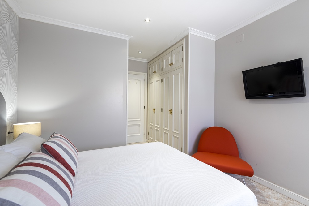 Un dormitorio con cama de matrimonio y TV de pantalla plana. Política de humo: no se puede fumar